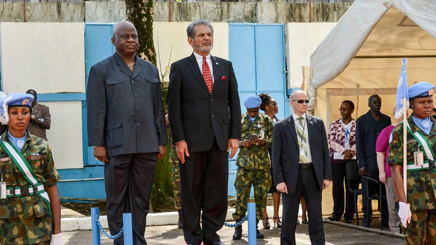 (Monrovia, 27 May 2016) – At a commemoration of the International Day of United Nations Peacekeepers held today at UNMIL headquarters in Monrovia, the Special Representative of the Secretary-General (SRSG) and Coordinator of UN Operations in Liberia, Farid Zarif, and the Coordinator of the Cabinet, Minister of Defence Brownie J. Samukai, laid wreaths in honour of the 238 uniformed and civilian peacekeepers who lost their lives while serving on the Mission since 2003.