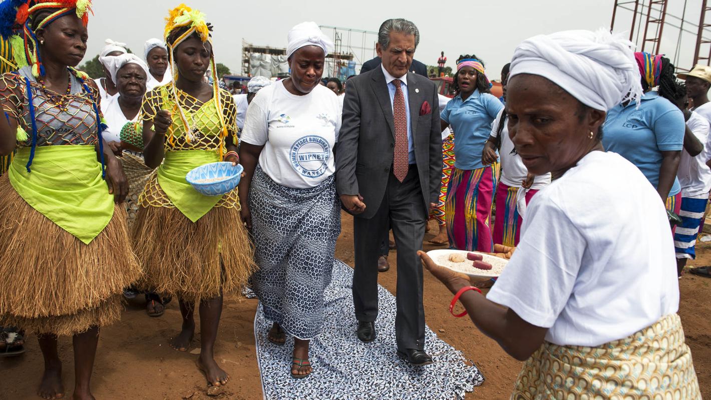 27 March 2018. Monrovia: Traditional Liberian communicators welcomes the arrival of the Special Representative of the Secretary-General and Head of UNMIL, Farid Zarif, during the popular farewell for the peacekeeping mission in the streets of Monrovia, Liberia. All these traditional communicators, members of eleven cultural organisations, have been hired by the Public Information Office in UNMIL for the past months to disseminate messages on the UNMIL termination, scheduled on March 30, and announce the United Nations, through the UN agencies, will continue to support the country on the access towards sustainable peace, education, healthcare, food security, humanitarian and development assistance.Photo by Albert Gonzalez Farran - UNMIL