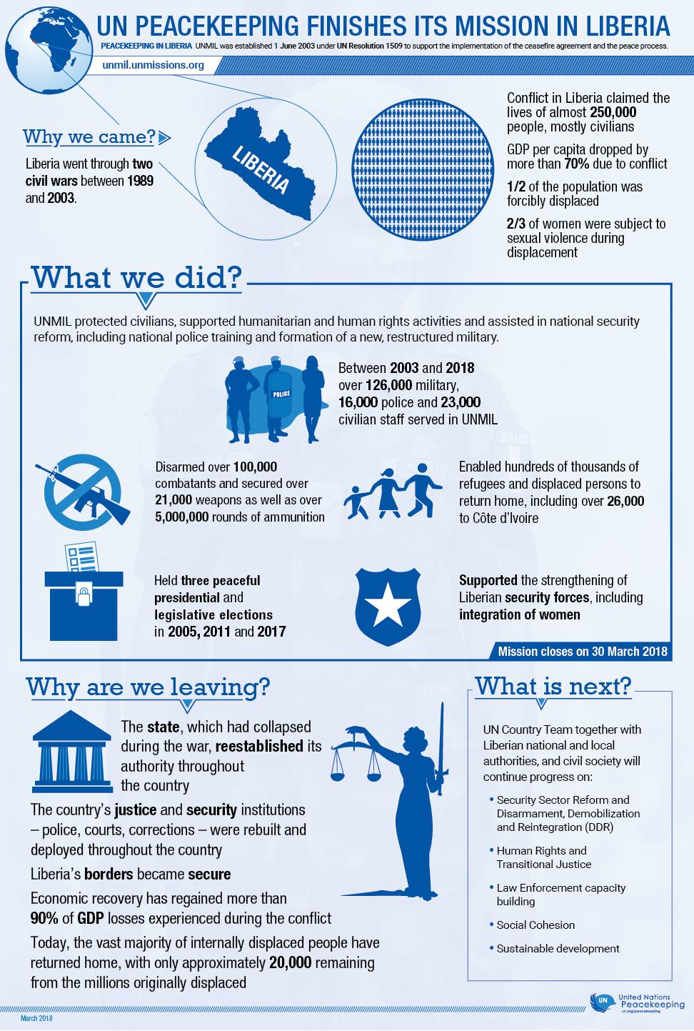 The United Nations Mission in Liberia was established in October 2003 to support for the implementation of a ceasefire agreement and peace process, and to assist with the maintenance and restoration of law and order throughout Liberia. The mission successfully completed its mandate on 30 March 2018.