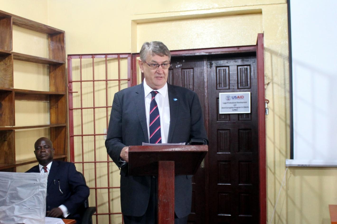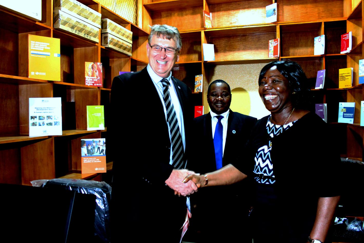 UNMIL Deputy Special Representative of the Secretary-General (DSRSG) for Political and Rule of Law, Mr. Waldemar Very, supporting the Judiciary institute, handed over books and equipment to establish a Human Rights Library…