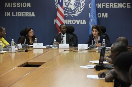Ms. Yasmina Bouziane, UNMIL Spokesperson, Mr. Peter Quaqua, President, Press Union of Liberia (PUL), Ms. Luisa Piette, UNESCO - Liberia Consultant and ICFJ Knight Fellow, Mr. Ronald Kayanja, Mr. Bill Burke, IREX Senior…
