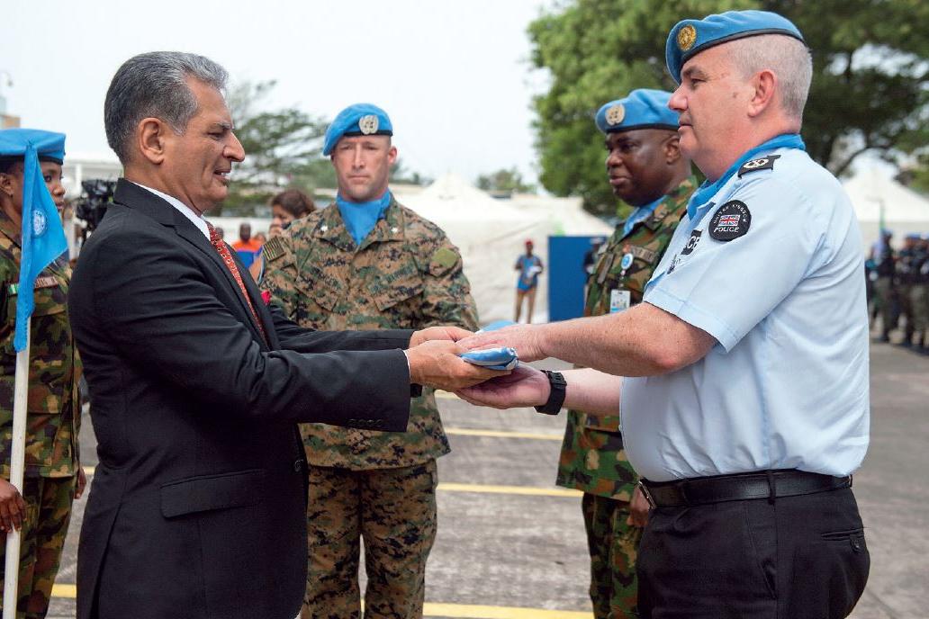 Farid Zarif, the Special Representative of the Secretary-General and Head of UNMIL (left), presents the UN flag to UNMIL Police Commissioner Simon Blatchly at UNMIL HQ during a farewell ceremony to honour uniformed personnel…