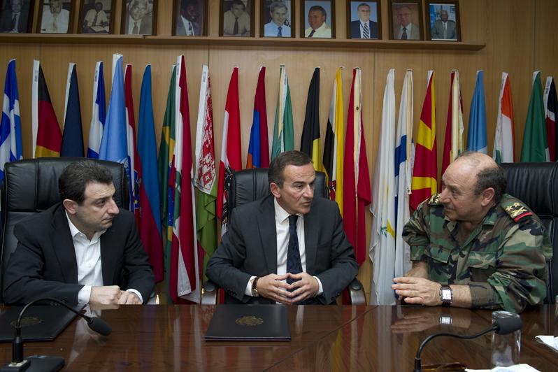 Minister of Social Affairs Mr. Wael Abou Faour (left), UNIFIL Deputy Head of Mission Mr. Milos Strugar (center) and LAF Major General Abdul Rahman Shehaitly speaking before the signature of the Memorandum of Understanding.