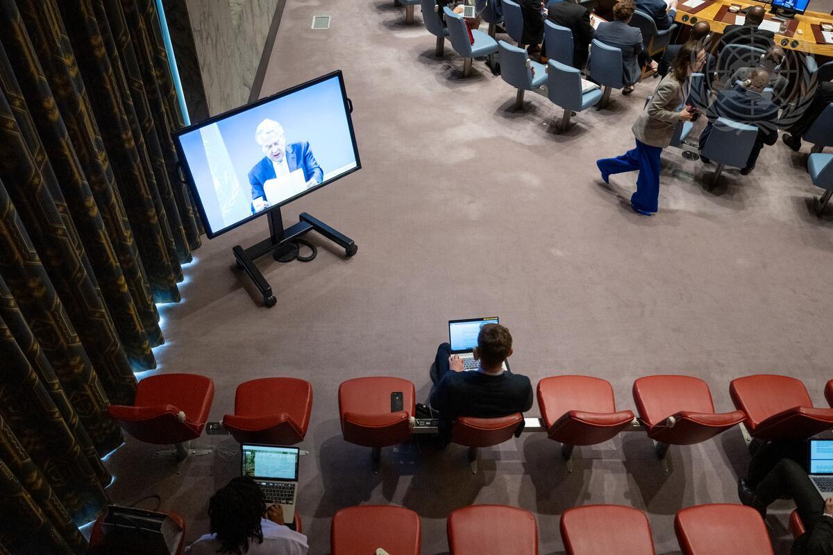 Tor Wennesland (on screen), Special Coordinator for the Middle East Peace Process, briefs the Security Council meeting on the situation in the Middle East, including the Palestinian question. (UN Photo/Manuel Elías - 27 June 2023)