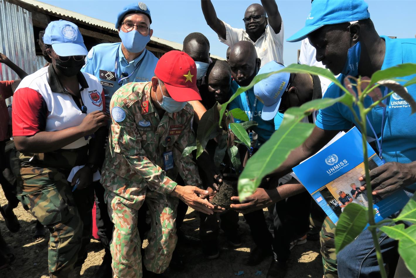 UNMISS and humanitarian partners came together with displaced communities for a tree-planting exercise to commemorate UN Day in Bentiu. Photo by Roseline Nzelle Nkwelle/UNMISS.